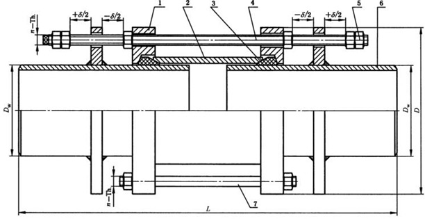 1-压盖 2-本体 3-密封圈 4-限位螺杆 5-螺母 6-限位伸缩管 7-螺柱BY 压盖松套传力补偿接头的基本尺寸