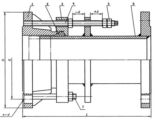1-本体 2-密封圈 3-压盖 4-限位螺杆 5-螺母 6-限位伸缩管 7-螺柱B2F 双法兰松套限位补偿接头的基本尺寸